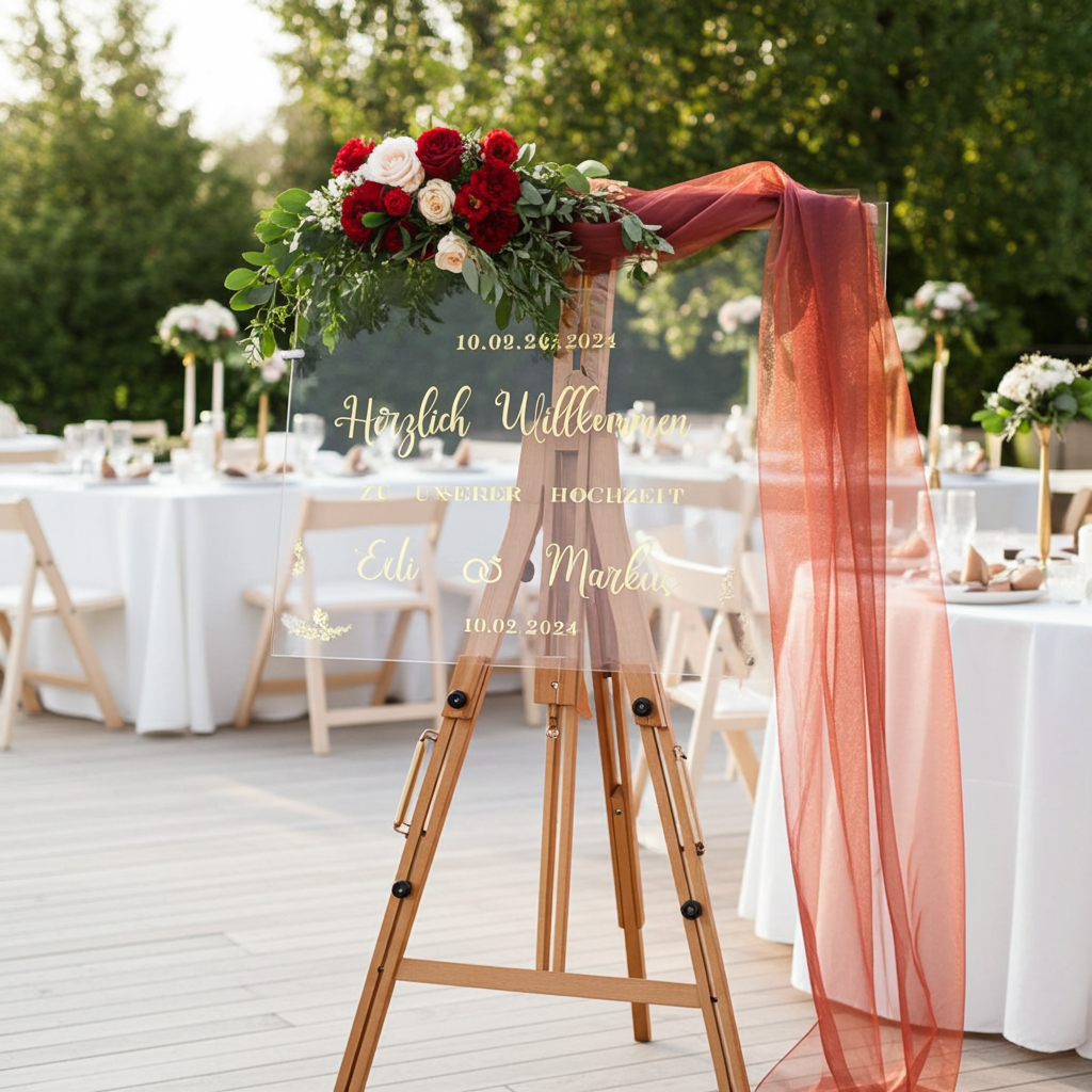 Acrylschild als Willkommensgruß zur Hochzeit.